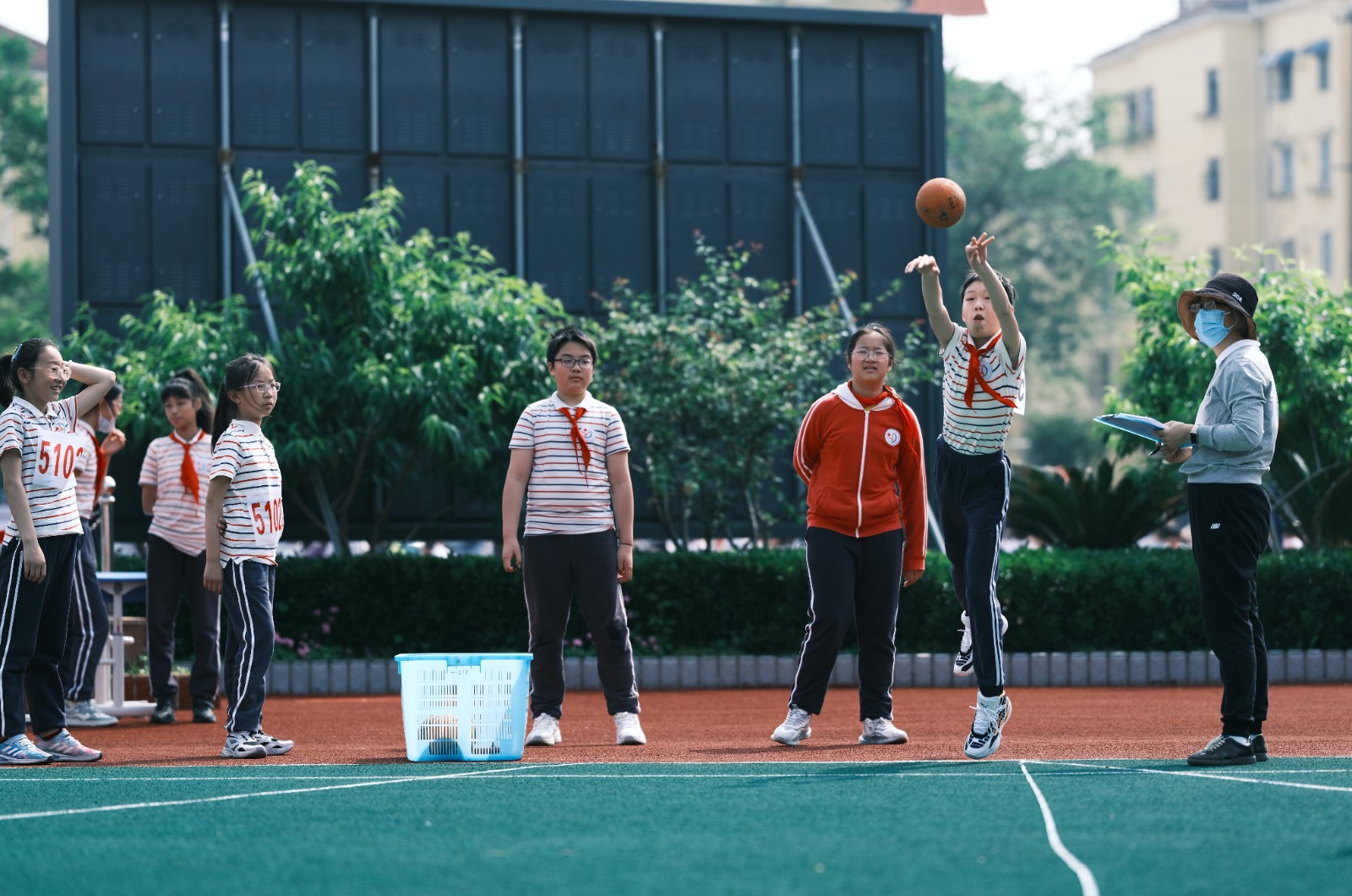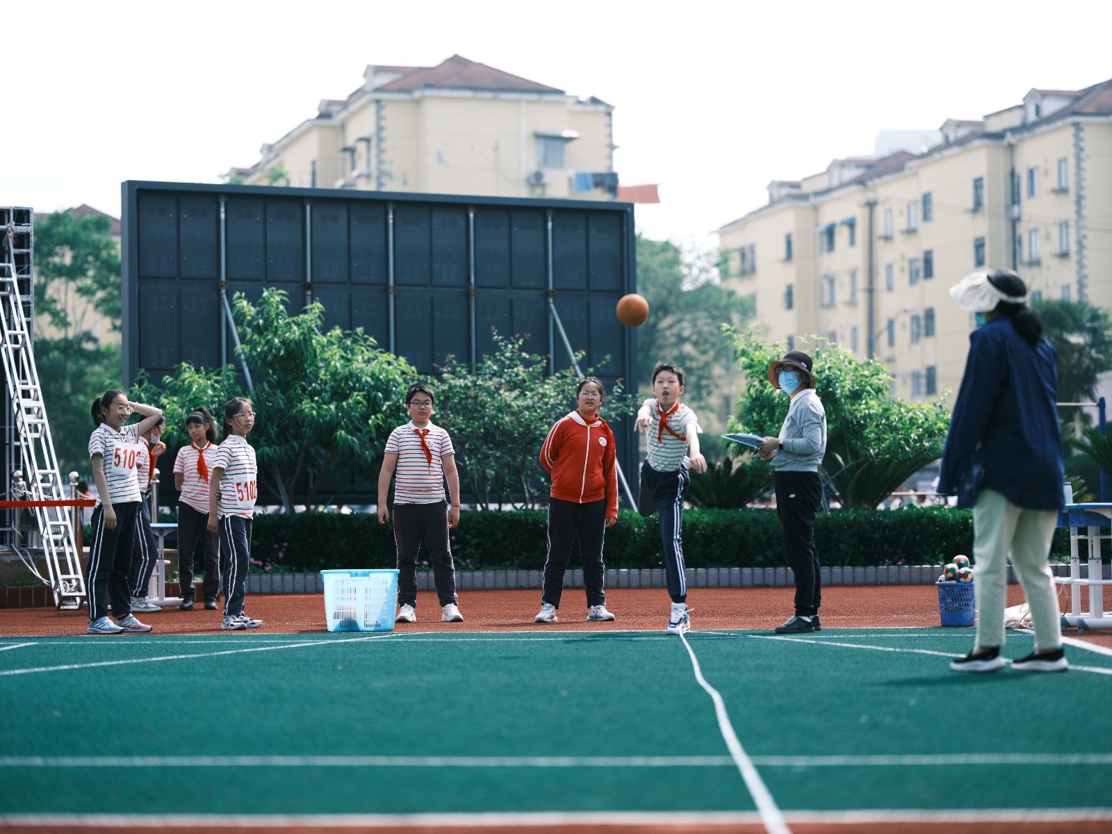 海绵球和实心球的投掷讲究的是腰、手、腿三力合一,快看,小运动员们侧站于投掷点,双眼注视前方,抬起手臂,已经做好了投掷的准备;转髋,挥臂,球在空中划过一道完美的弧线。