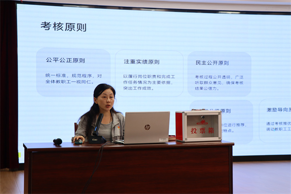 会上,王珏校长针对本次教代会讨论的文本进行了详尽的解读。本方案旨在坚持公平、公正、公开的原则,注重实绩,全面考核,旨在表彰先进,树立典范,营造爱岗敬业、积极进取、乐于奉献的工作氛围,促进教师队伍整体素质的提升。
